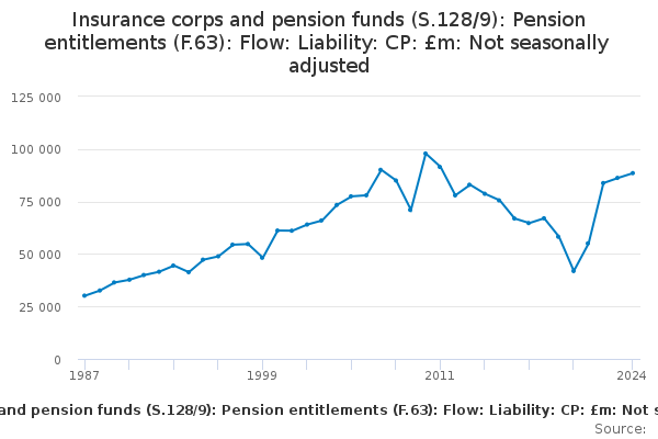 Download this time seriesInsurance corps and pension funds (S.128/9): Pension entitlements (F.63): Flow: Liability: CP: £m: Not seasonally adjusted