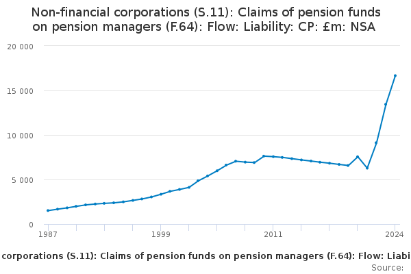 Download this time seriesNon-financial corporations (S.11): Claims of pension funds on pension managers (F.64): Flow: Liability: CP: £m: NSA