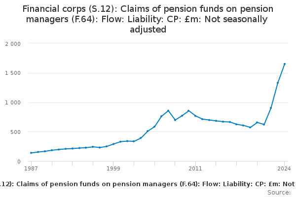 Download this time seriesFinancial corps (S.12): Claims of pension funds on pension managers (F.64): Flow: Liability: CP: £m: Not seasonally adjusted