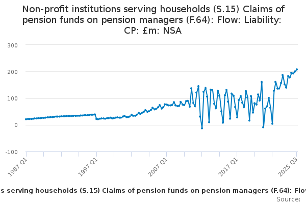 Download this time seriesNon-profit institutions serving households (S.15) Claims of pension funds on pension managers (F.64): Flow: Liability: CP: £m: NSA
