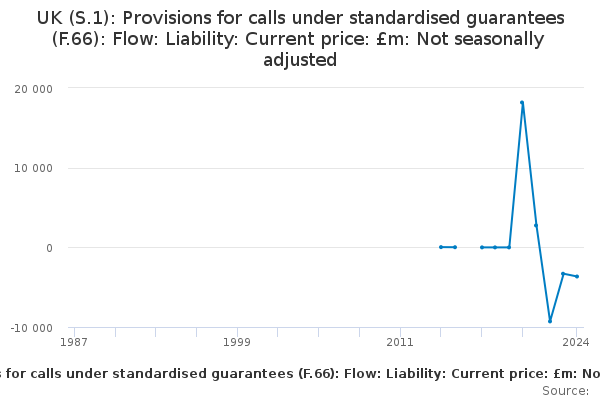 Download this time seriesUK (S.1): Provisions for calls under standardised guarantees (F.66): Flow: Liability: Current price: £m: Not seasonally adjusted