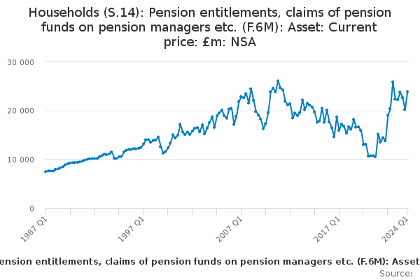Download this time seriesHouseholds (S.14): Pension entitlements, claims of pension funds on pension managers etc. (F.6M): Asset: Current price: £m: NSA