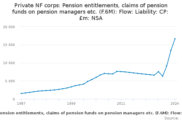Download this time seriesPrivate NF corps: Pension entitlements, claims of pension funds on pension managers etc. (F.6M): Flow: Liability: CP: £m: NSA