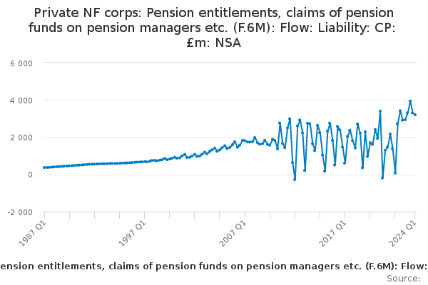 Download this time seriesPrivate NF corps: Pension entitlements, claims of pension funds on pension managers etc. (F.6M): Flow: Liability: CP: £m: NSA