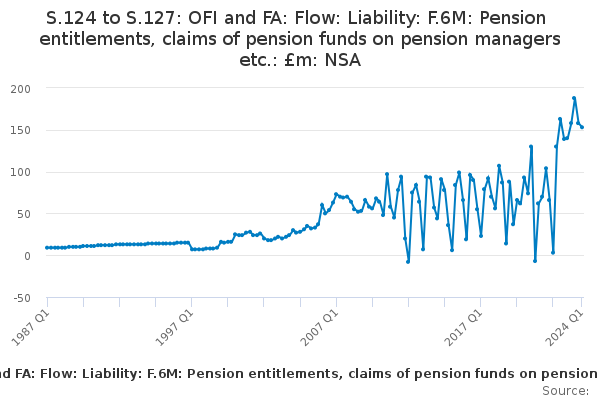 Download this time seriesS.124 to S.127: OFI and FA: Flow: Liability: F.6M: Pension entitlements, claims of pension funds on pension managers etc.: £m: NSA