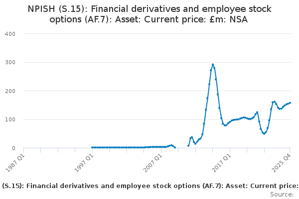 Download this time seriesNPISH (S.15): Financial derivatives and employee stock options (AF.7): Asset: Current price: £m: NSA
