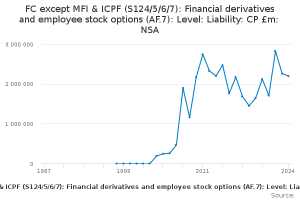 Download this time seriesFC except MFI & ICPF (S124/5/6/7): Financial derivatives and employee stock options (AF.7): Level: Liability: CP £m: NSA