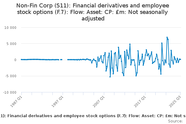 Download this time seriesNon-Fin Corp (S11): Financial derivatives and employee stock options (F.7): Flow: Asset: CP: £m: Not seasonally adjusted