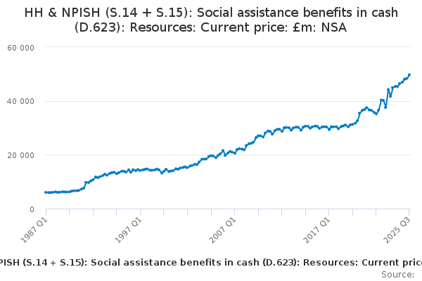 Download this time seriesHH & NPISH (S.14 + S.15): Social assistance benefits in cash (D.623): Resources: Current price: £m: NSA