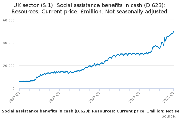 Download this time seriesUK sector (S.1): Social assistance benefits in cash (D.623): Resources: Current price: £million: Not seasonally adjusted