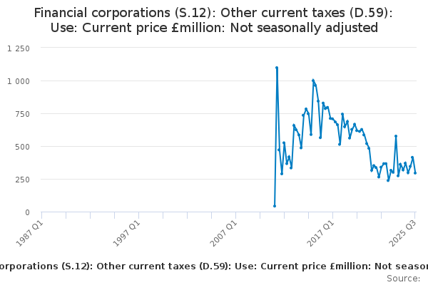 Download this time seriesFinancial corporations (S.12): Other current taxes (D.59): Use: Current price £million: Not seasonally adjusted