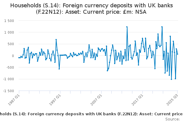 Download this time seriesHouseholds (S.14): Foreign currency deposits with UK banks (F.22N12): Asset: Current price: £m: NSA