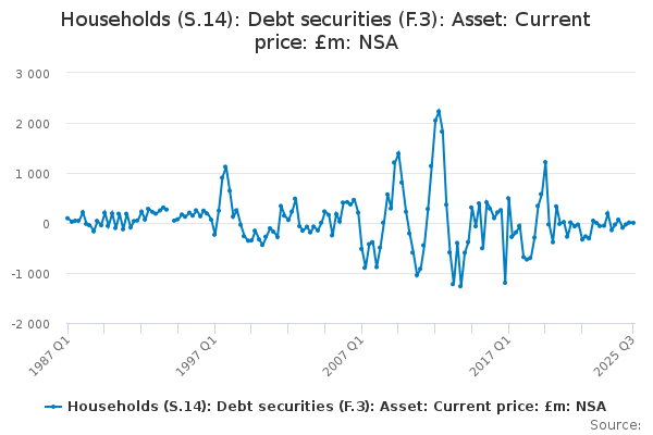 Download this time seriesHouseholds (S.14): Debt securities (F.3): Asset: Current price: £m: NSA