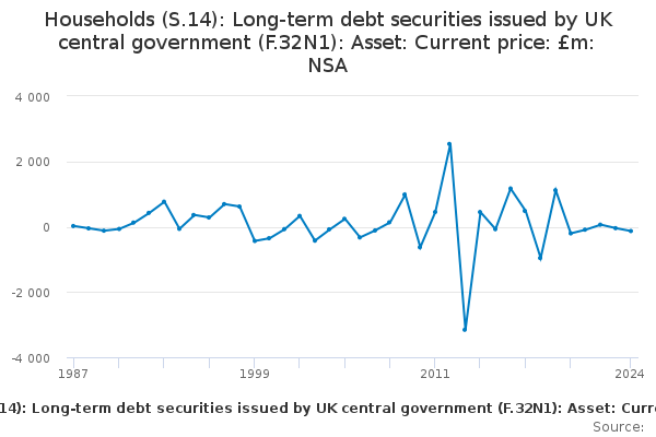 Download this time seriesHouseholds (S.14): Long-term debt securities issued by UK central government (F.32N1): Asset: Current price: £m: NSA