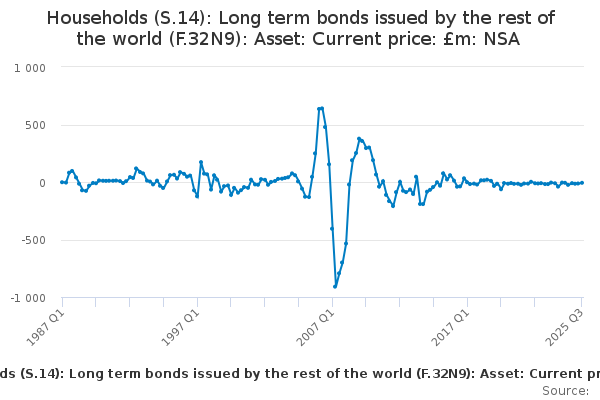 Download this time seriesHouseholds (S.14): Long term bonds issued by the rest of the world (F.32N9): Asset: Current price: £m: NSA