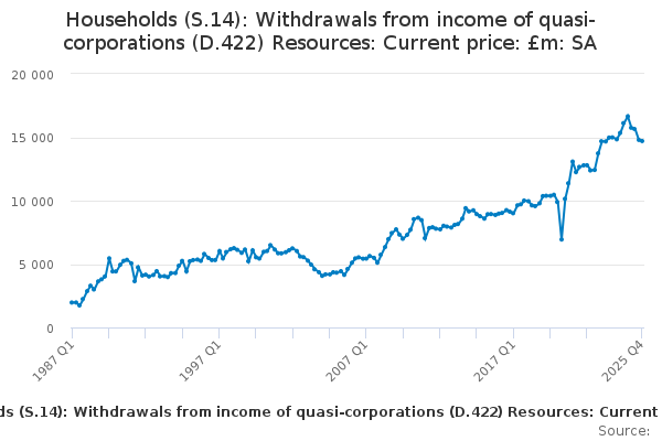 Download this time seriesHouseholds (S.14): Withdrawals from income of quasi-corporations (D.422) Resources: Current price: £m: SA