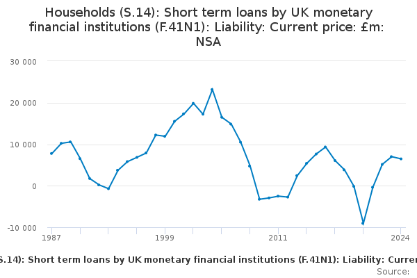 Download this time seriesHouseholds (S.14): Short term loans by UK monetary financial institutions (F.41N1): Liability: Current price: £m: NSA