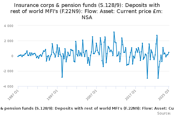 Download this time seriesInsurance corps & pension funds (S.128/9): Deposits with rest of world MFI's (F.22N9): Flow: Asset: Current price £m: NSA