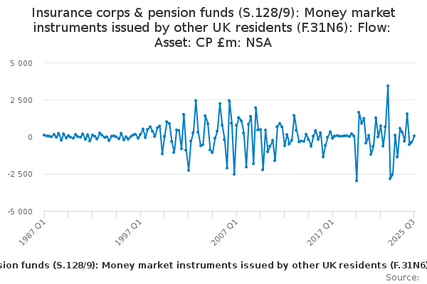 Download this time seriesInsurance corps & pension funds (S.128/9): Money market instruments issued by other UK residents (F.31N6): Flow: Asset: CP £m: NSA