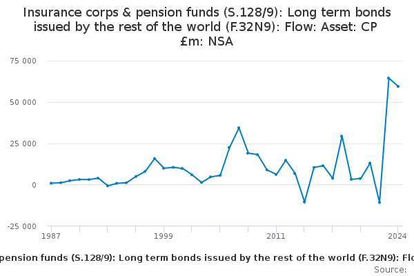 Download this time seriesInsurance corps & pension funds (S.128/9): Long term bonds issued by the rest of the world (F.32N9): Flow: Asset: CP £m: NSA