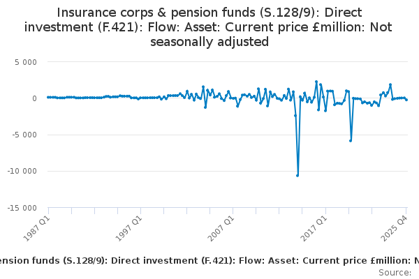 Download this time seriesInsurance corps & pension funds (S.128/9): Direct investment (F.421): Flow: Asset: Current price £million: Not seasonally adjusted