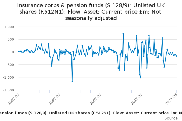 Download this time seriesInsurance corps & pension funds (S.128/9): Unlisted UK shares (F.512N1): Flow: Asset: Current price £m: Not seasonally adjusted