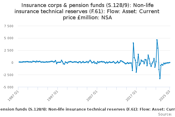 Download this time seriesInsurance corps & pension funds (S.128/9): Non-life insurance technical reserves (F.61): Flow: Asset: Current price £million: NSA