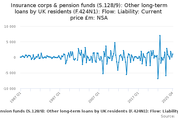 Download this time seriesInsurance corps & pension funds (S.128/9): Other long-term loans by UK residents (F.424N1): Flow: Liability: Current price £m: NSA