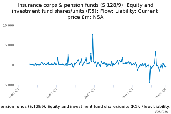 Download this time seriesInsurance corps & pension funds (S.128/9): Equity and investment fund shares/units (F.5): Flow: Liability: Current price £m: NSA