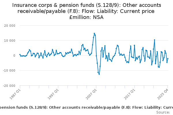 Download this time seriesInsurance corps & pension funds (S.128/9): Other accounts receivable/payable (F.8): Flow: Liability: Current price £million: NSA