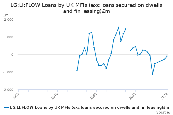 Download this time seriesLG:LI:FLOW:Loans by UK MFIs (exc loans secured on dwells and fin leasing)£m