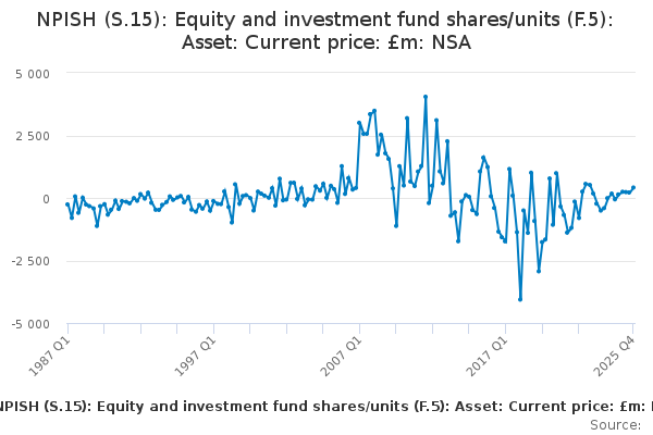 Download this time seriesNPISH (S.15): Equity and investment fund shares/units (F.5): Asset: Current price: £m: NSA