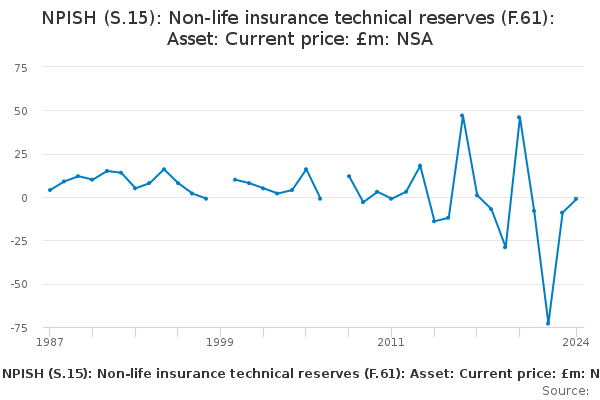 Download this time seriesNPISH (S.15): Non-life insurance technical reserves (F.61): Asset: Current price: £m: NSA