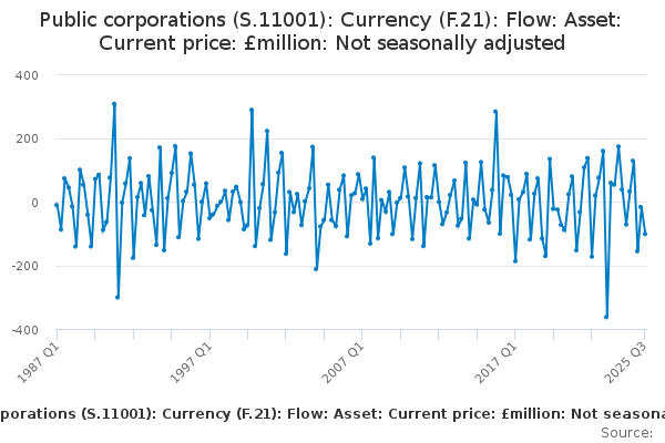 Download this time seriesPublic corporations (S.11001): Currency (F.21): Flow: Asset: Current price: £million: Not seasonally adjusted