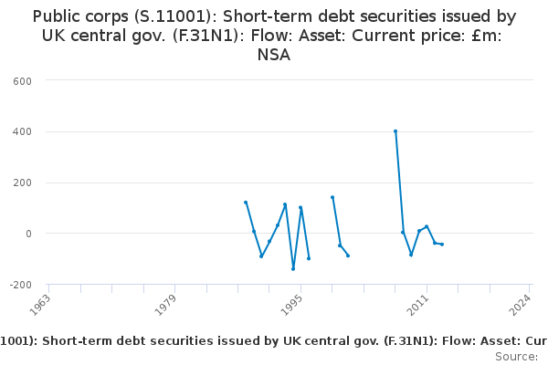 Download this time seriesPublic corps (S.11001): Short-term debt securities issued by UK central gov. (F.31N1): Flow: Asset: Current price: £m: NSA