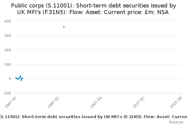 Download this time seriesPublic corps (S.11001): Short-term debt securities issued by UK MFI's (F.31N5): Flow: Asset: Current price: £m: NSA