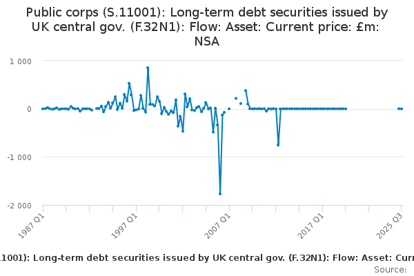 Download this time seriesPublic corps (S.11001): Long-term debt securities issued by UK central gov. (F.32N1): Flow: Asset: Current price: £m: NSA