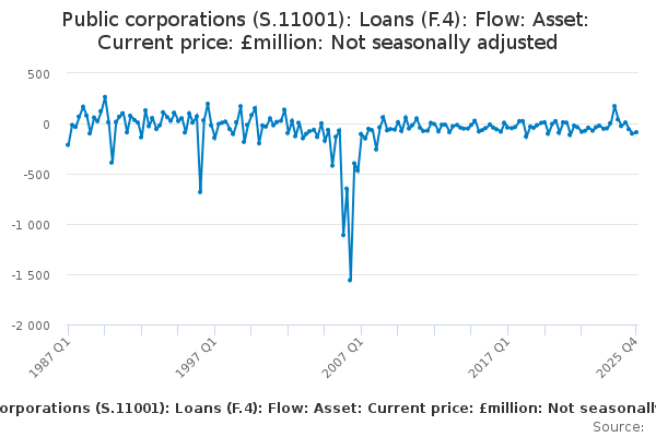 Download this time seriesPublic corporations (S.11001): Loans (F.4): Flow: Asset: Current price: £million: Not seasonally adjusted