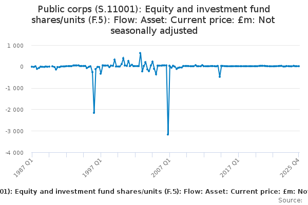 Download this time seriesPublic corps (S.11001): Equity and investment fund shares/units (F.5): Flow: Asset: Current price: £m: Not seasonally adjusted