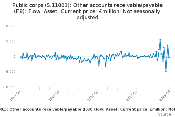 Download this time seriesPublic corps (S.11001): Other accounts receivable/payable (F.8): Flow: Asset: Current price: £million: Not seasonally adjusted