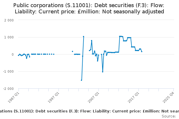 Download this time seriesPublic corporations (S.11001): Debt securities (F.3): Flow: Liability: Current price: £million: Not seasonally adjusted