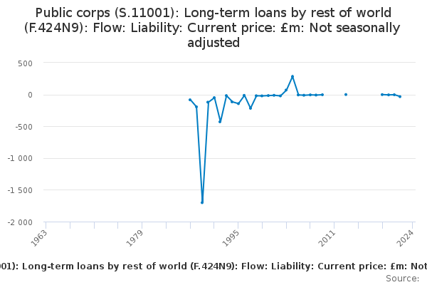 Download this time seriesPublic corps (S.11001): Long-term loans by rest of world (F.424N9): Flow: Liability: Current price: £m: Not seasonally adjusted