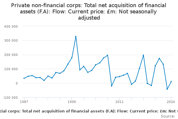 Download this time seriesPrivate non-financial corps: Total net acquisition of financial assets (F.A): Flow: Current price: £m: Not seasonally adjusted