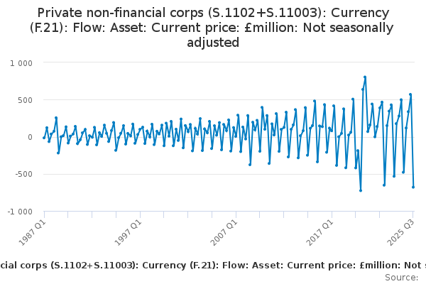 Download this time seriesPrivate non-financial corps (S.1102+S.11003): Currency (F.21): Flow: Asset: Current price: £million: Not seasonally adjusted