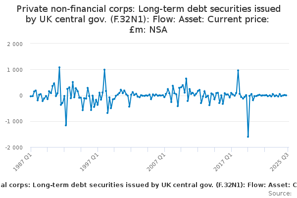 Download this time seriesPrivate non-financial corps: Long-term debt securities issued by UK central gov. (F.32N1): Flow: Asset: Current price: £m: NSA