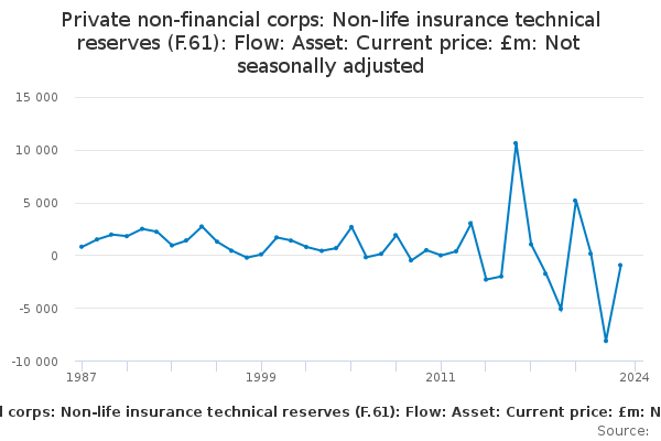 Download this time seriesPrivate non-financial corps: Non-life insurance technical reserves (F.61): Flow: Asset: Current price: £m: Not seasonally adjusted
