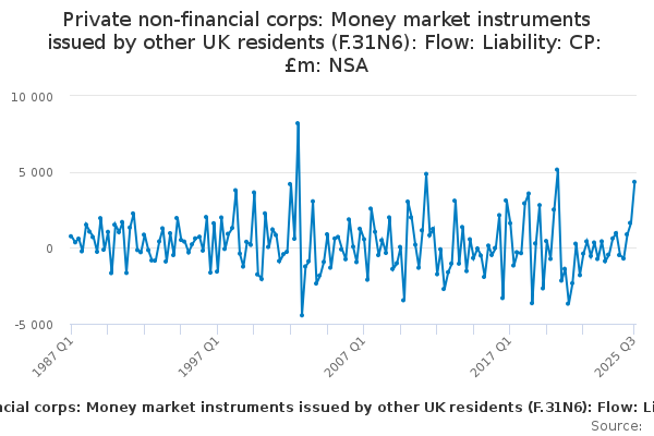 Download this time seriesPrivate non-financial corps: Money market instruments issued by other UK residents (F.31N6): Flow: Liability: CP: £m: NSA