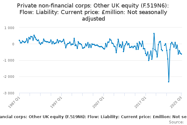 Download this time seriesPrivate non-financial corps: Other UK equity (F.519N6): Flow: Liability: Current price: £million: Not seasonally adjusted