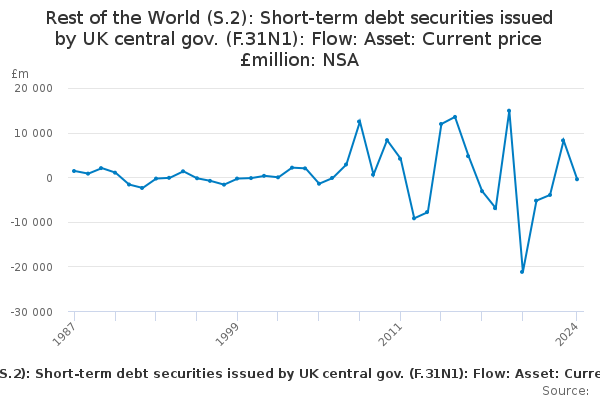 Download this time seriesRest of the World (S.2): Short-term debt securities issued by UK central gov. (F.31N1): Flow: Asset: Current price £million: NSA