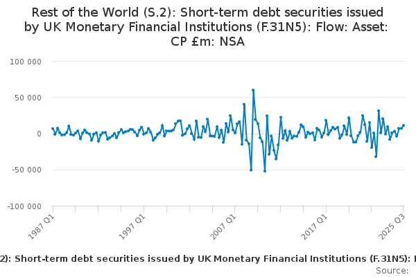 Download this time seriesRest of the World (S.2): Short-term debt securities issued by UK Monetary Financial Institutions (F.31N5): Flow: Asset: CP £m: NSA